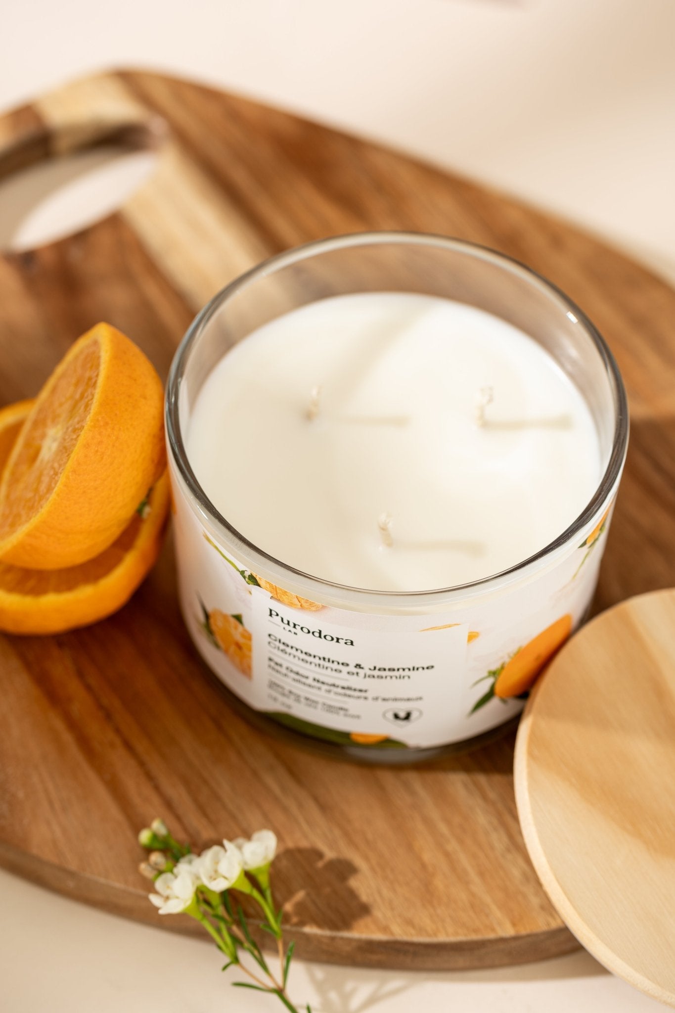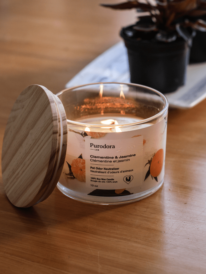 Fabriquée à la main au Québec à partir de cire 100% soya, notre bougie 3 mèches Clémentine et jasmin neutralise les odeurs d’animaux tout en laissant un agréable parfum dans l’air ambiant. Tous les ingrédients ont été choisis avec soin afin d’être sécuritaires pour les animaux et la planète.